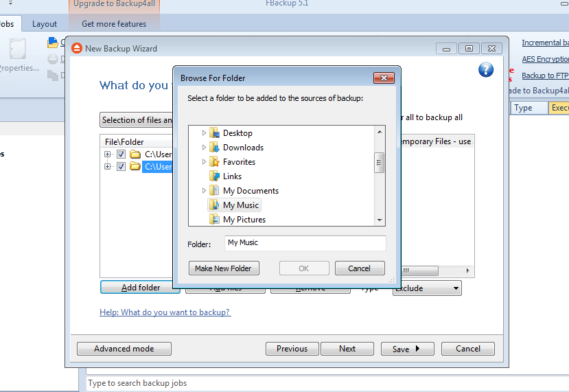 - Жмём next и выбираем папку (add folder), которую нужно архивировать (так можно выбрать несколько папок и файлов)