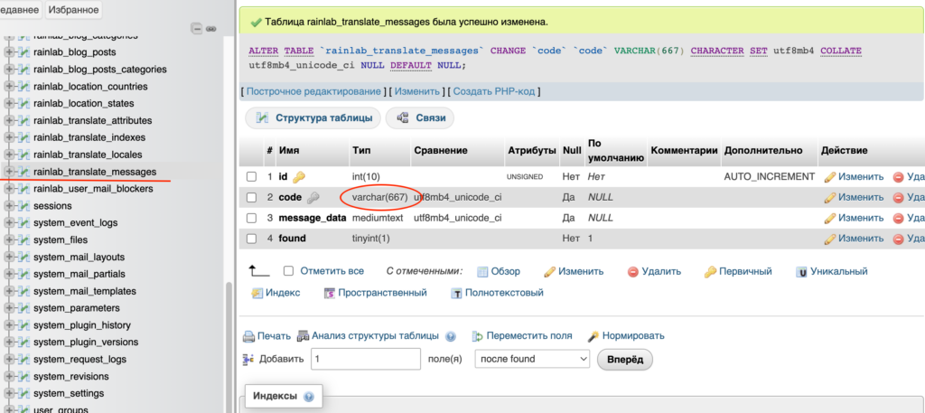 ALTER TABLE `rainlab_translate_messages` CHANGE `code` `code` VARCHAR(667) CHARACTER SET utf8mb4 COLLATE utf8mb4_unicode_ci NULL DEFAULT NULL;