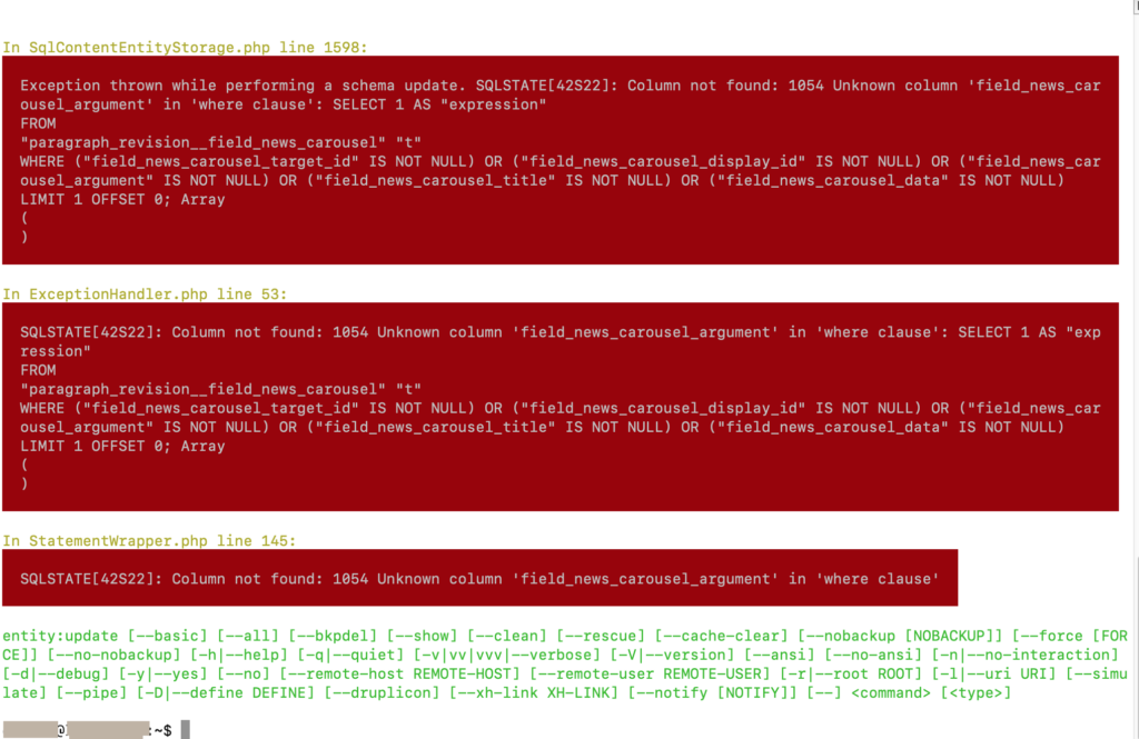 И выясняем, что аналогичная ситуация в с aragraph_revision__field_news_carousel. Поэтому тоже добавляем 2 колонки с _argument и _title. Такие же манипуляции проделываем и с paragraph_revision__field_views_block_content.